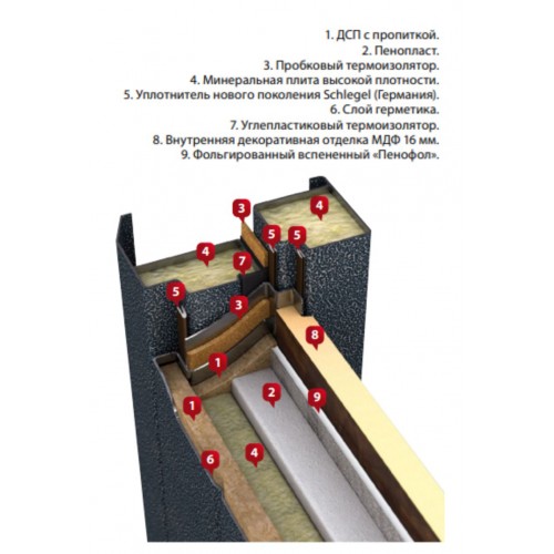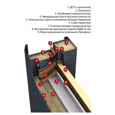 Основной особенностью данной двери является ее конструкция с терморазрывом, восьмислойным утеплением, обеспечивающая повышенную теплоизоляцию помещения.
